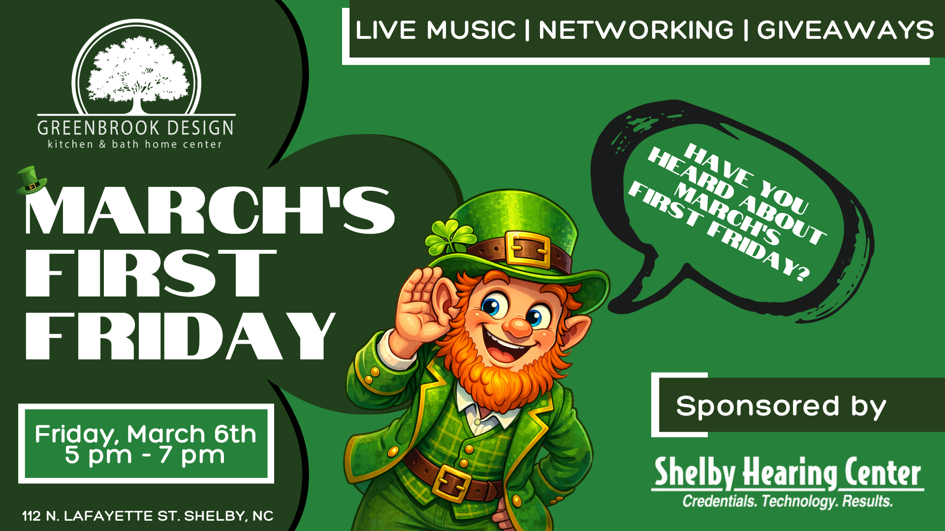 Join us for First Friday, March 6th, from 5–7 PM for an evening of live music, networking, and giveaways at Greenbrook Design.